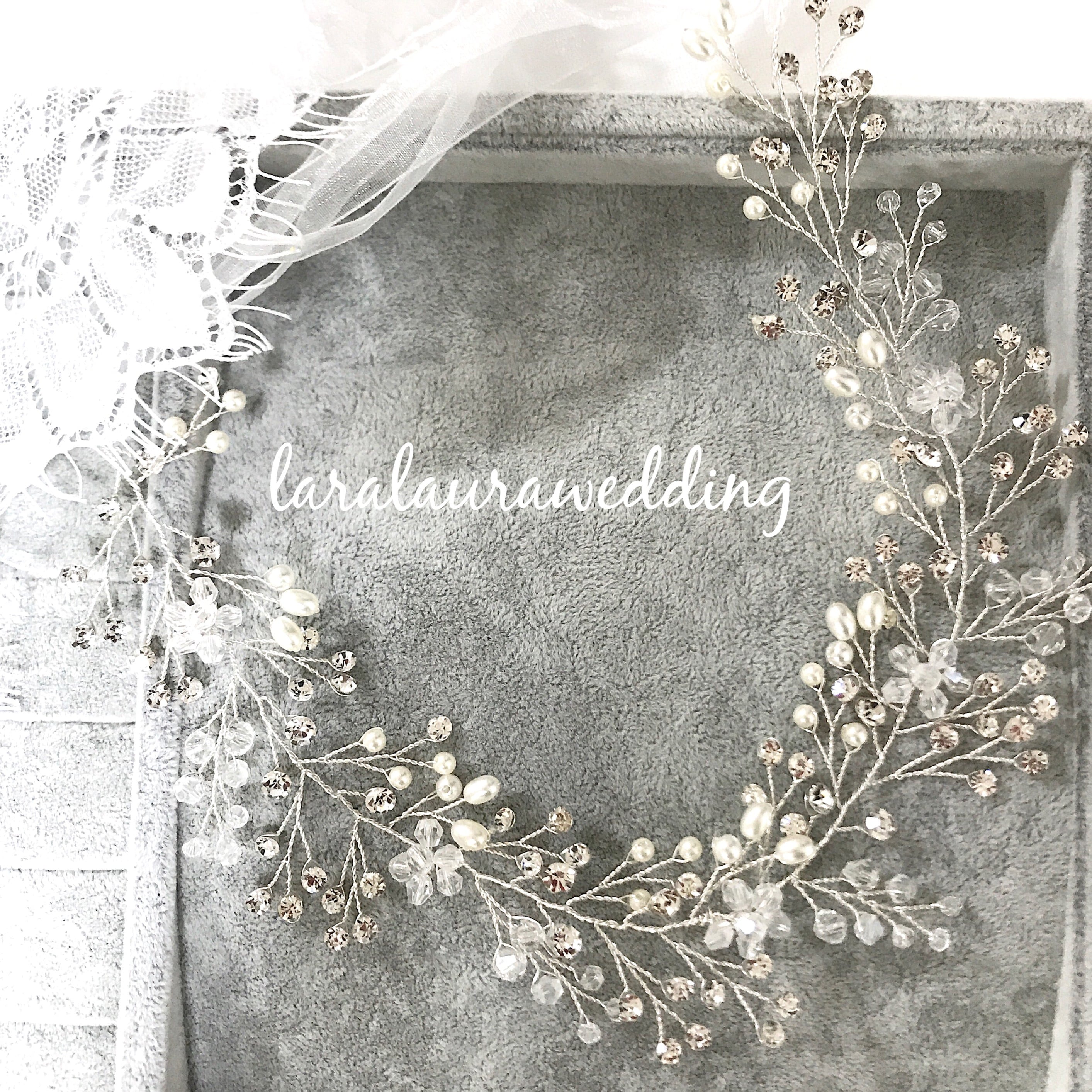花冠のように前に持っていくスタイルやシニヨンに合わせても様々な雰囲気でお召しいただけます。